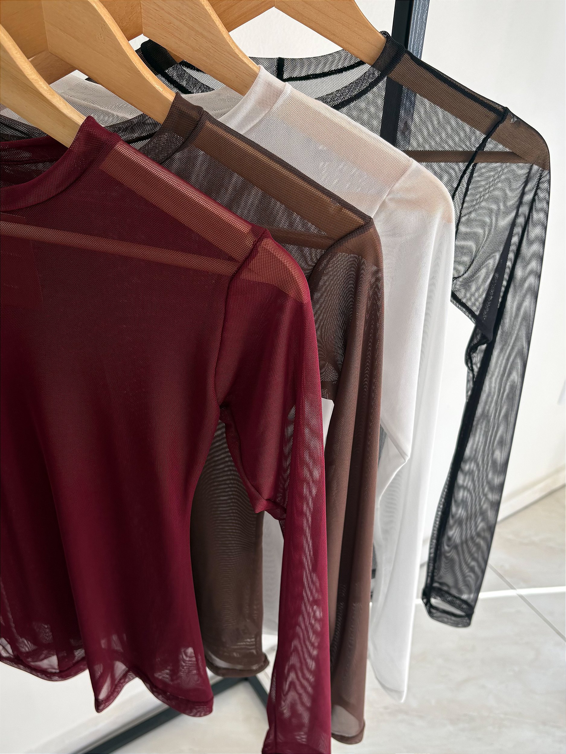 Blusa necessaria no guarda-roupa de qualquer mulher, uma de cada cor de preferencia! Tule com gola baixa e manga comprida.