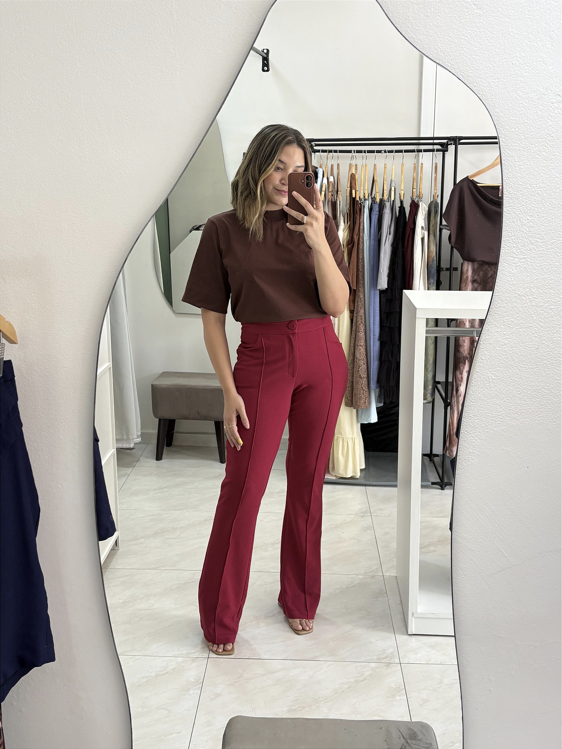 Calça inspiração zara, Tecido em poliester e com bastante elastano, se ajustando totalmente no corpo. Estilo "boca de sino", com detalhes que fazem a diferença: botão forrado no mesmo tecido, recorte e bolsos frontais.