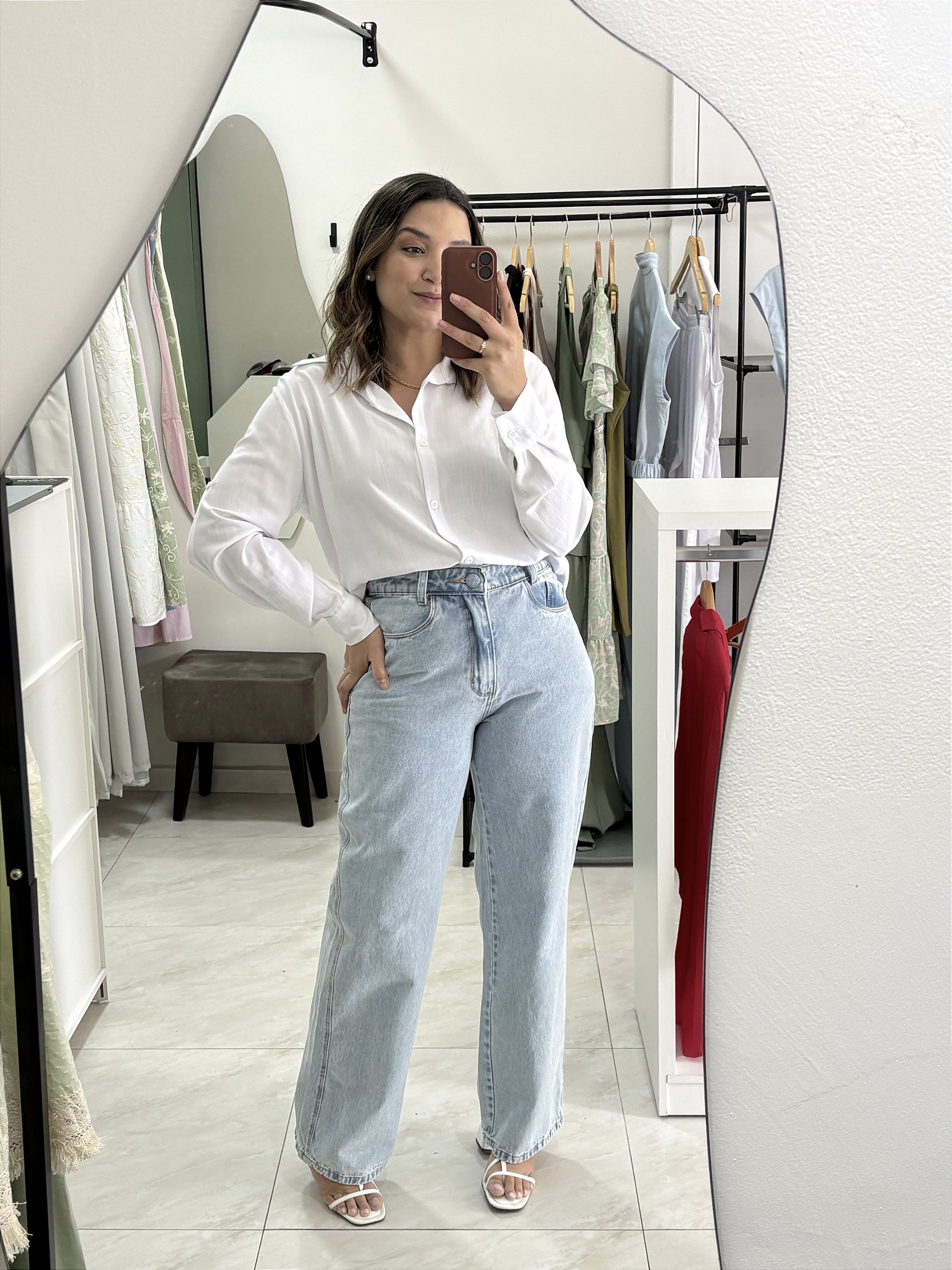 Calça wide leg com lavagem clara, bolsos frontais e atras, e botão forrado. (Mo usa 40)