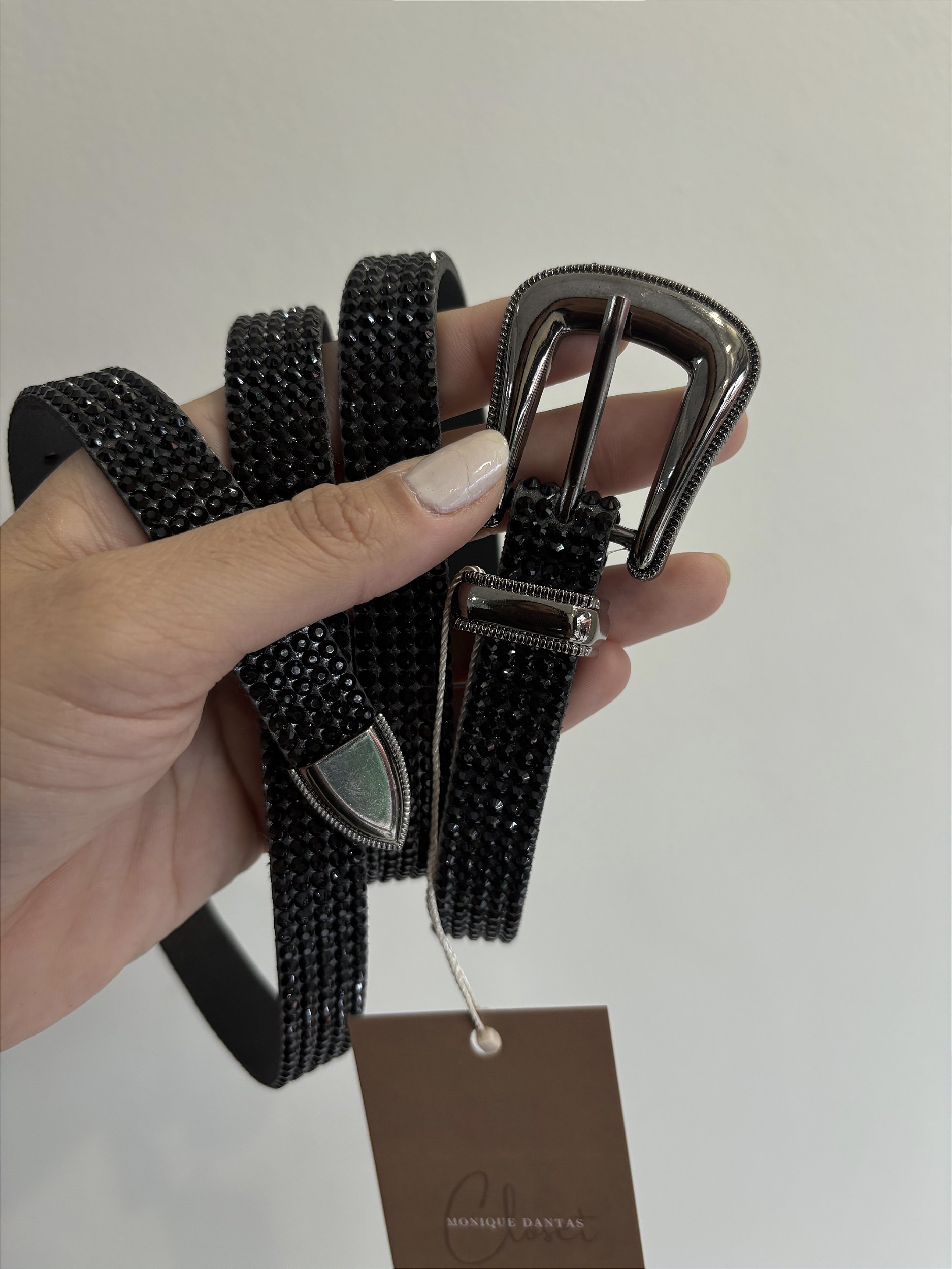 Cinto preto todo em strass, fivela no prata envelhecido, com detalhe na ponta em prata também, 115cm.