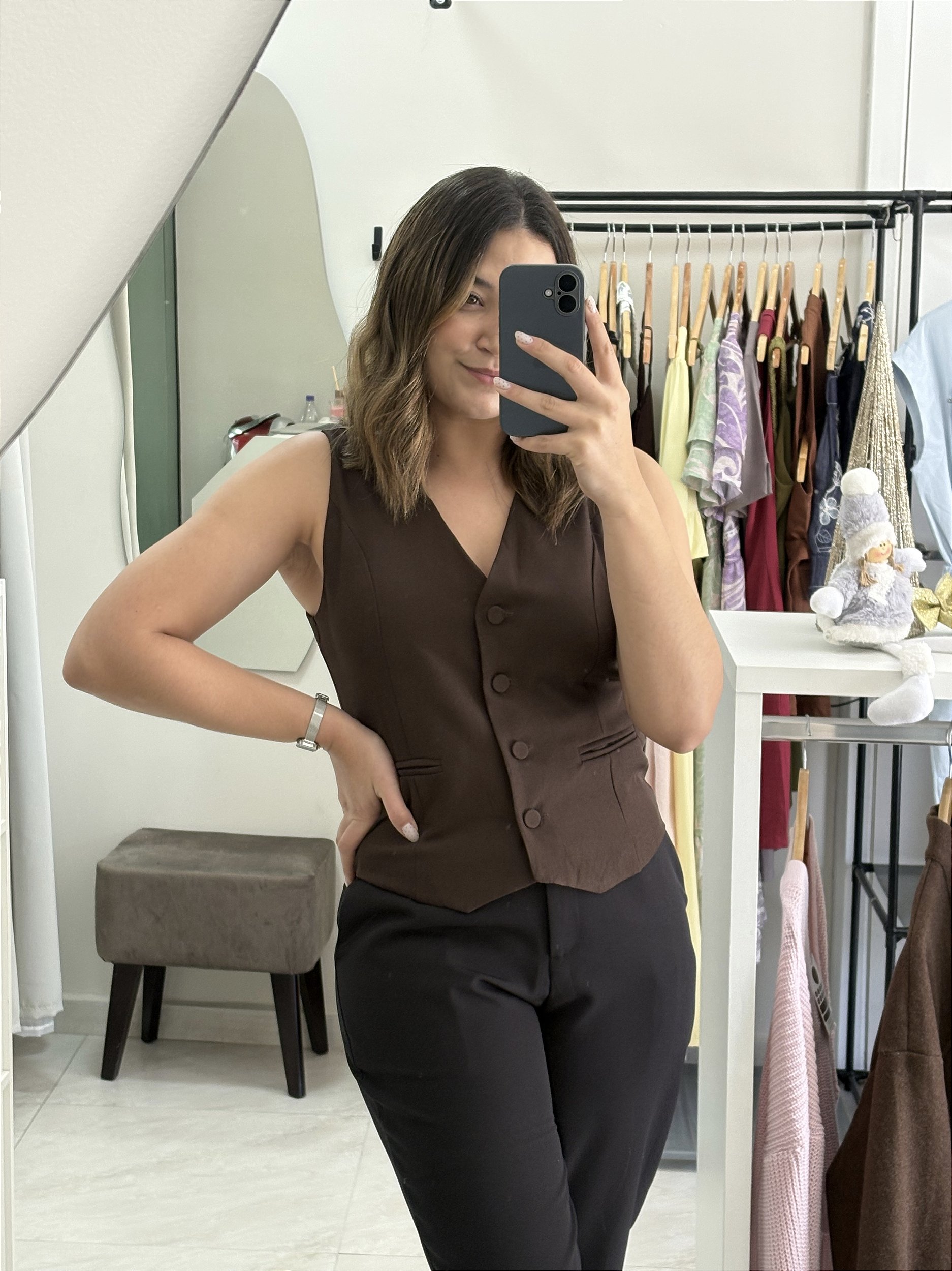 Colete classico em alfaiataria, todo forrando por dentro, bolso fake e botões forrados.