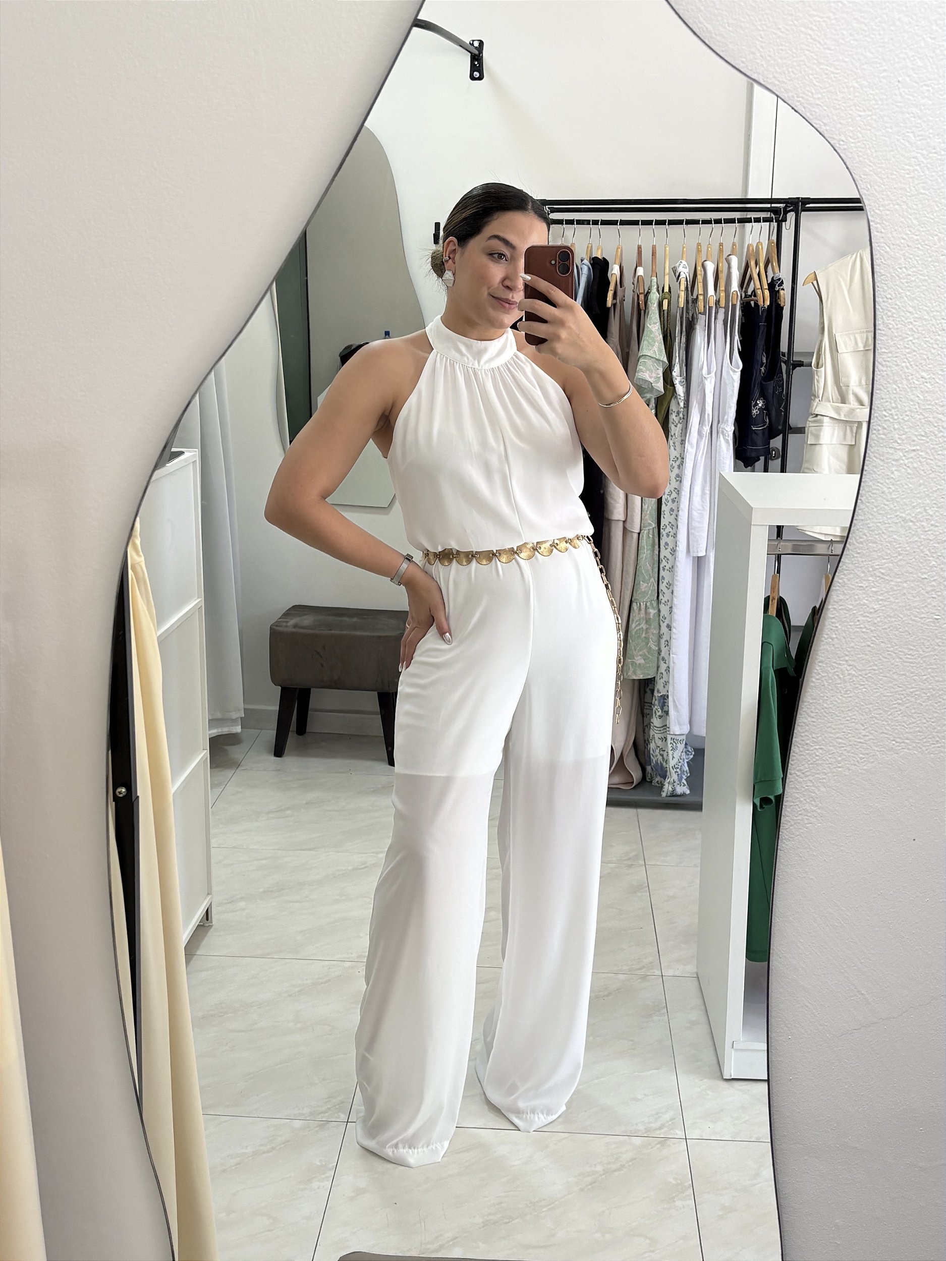 Macacão em chiffon, super leve, confortavel e elegante. Fecho em ziper na parte de tras e amarração no pescoço.