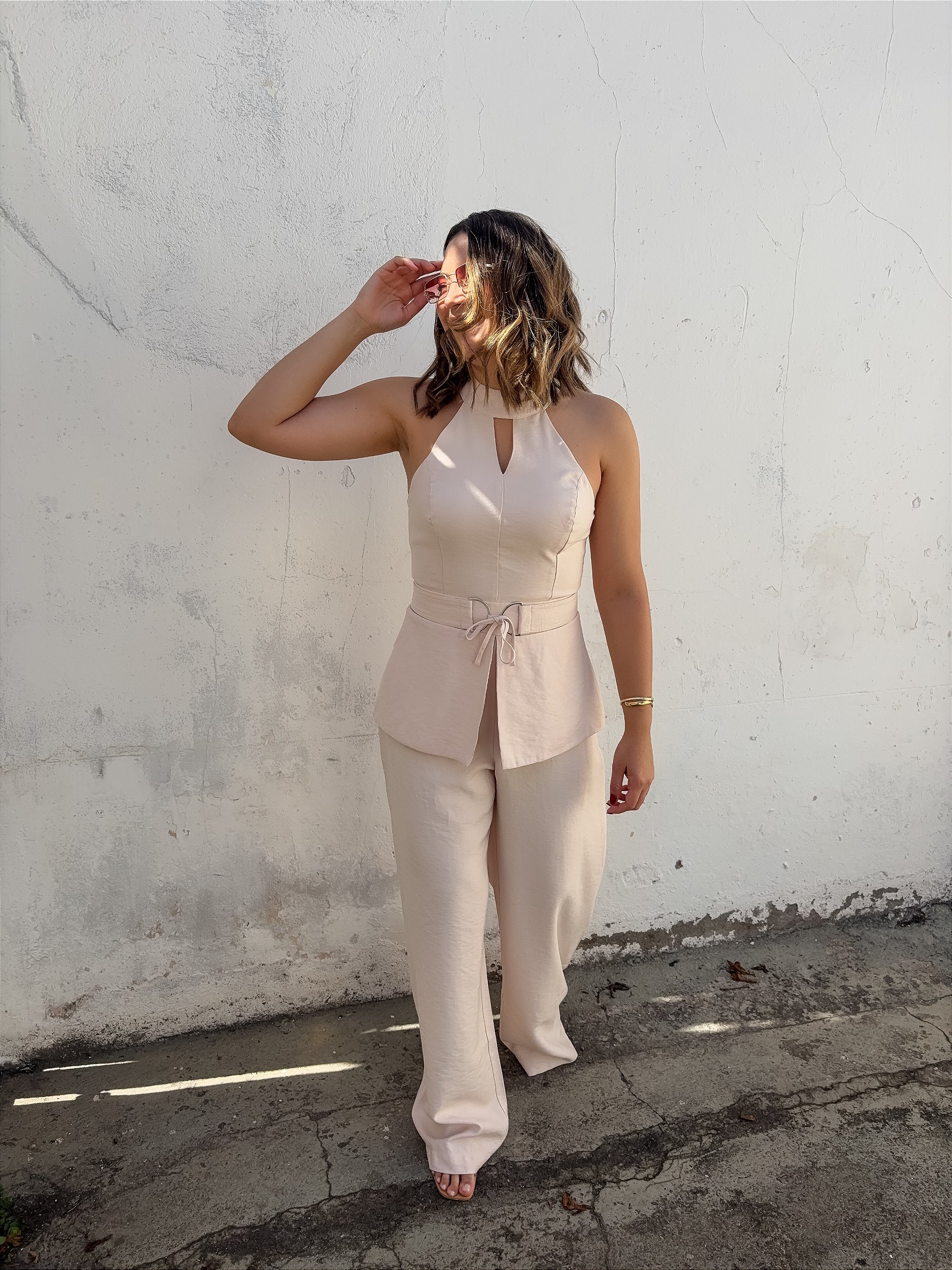 Macacão Luxo, super elegante. Parte de cima em peplum imitando um conjunto. Acinturado com amaração na parte frontal como um cinto e fecho nas costas em zíper e botões no pescoço.