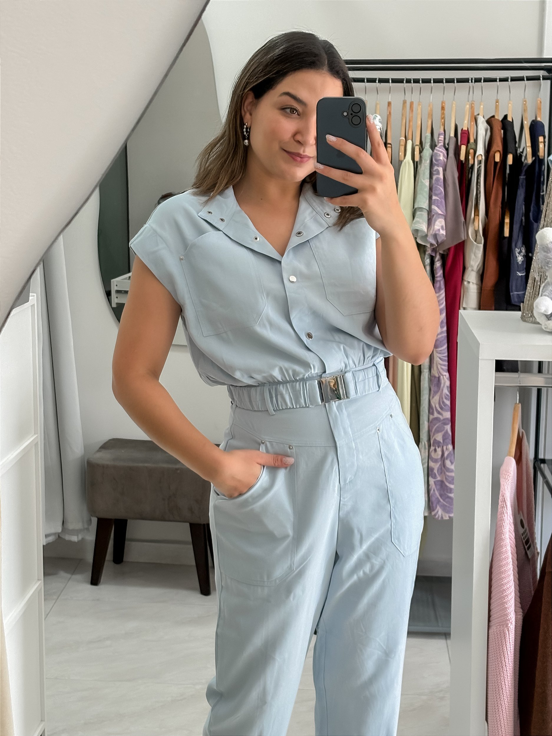 Macacão calça comprida. Fecho por zíper e botões. Gola alta (Podendo ser usada com decote) e bolsos frontais.