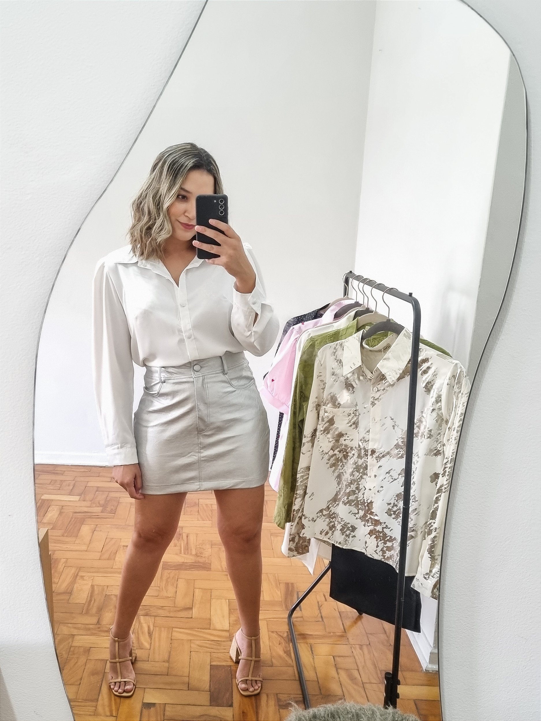 Saia Metalizada no prata com botão forrado.