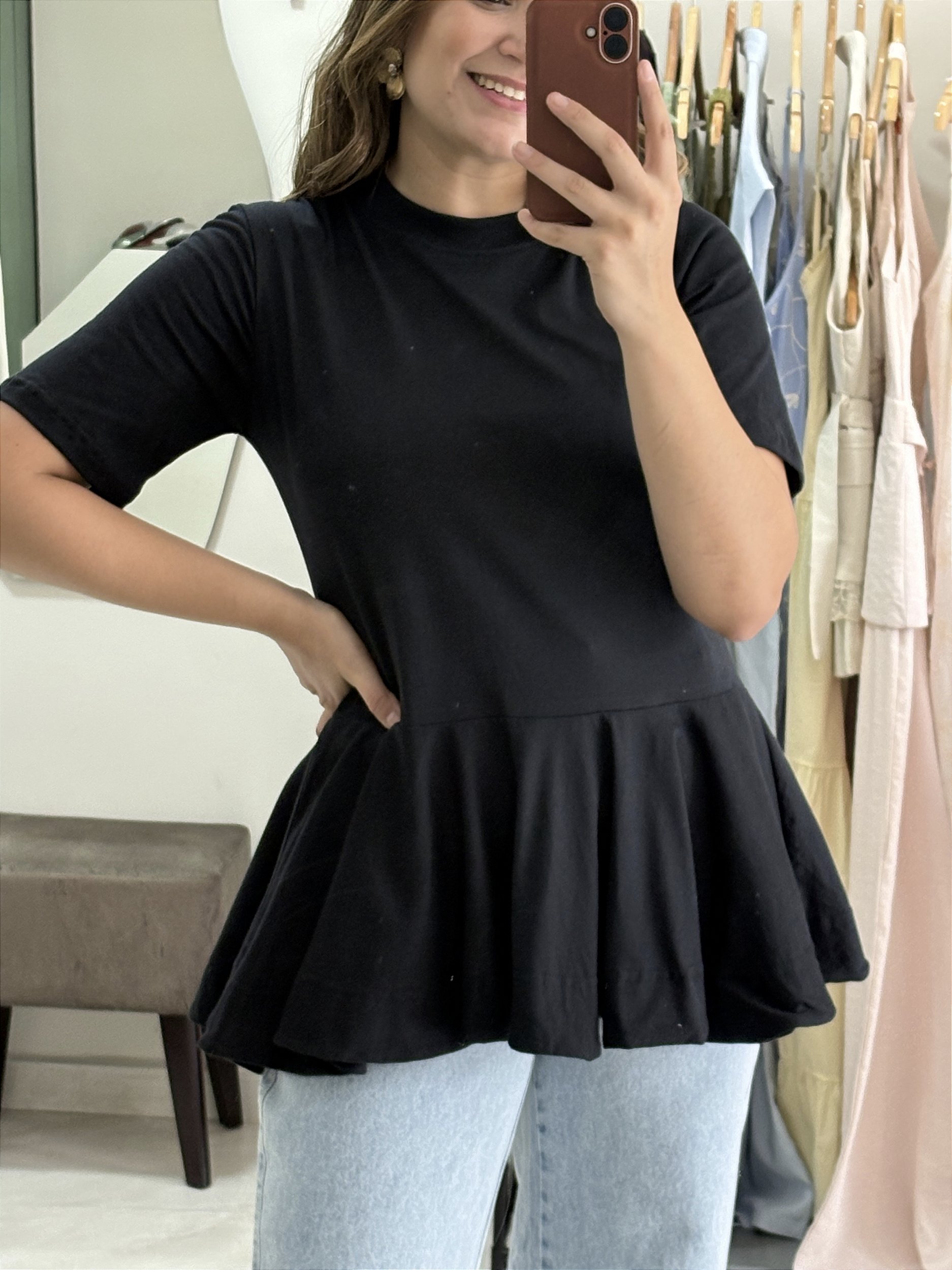 O verdadeiro significado de "basico nada basico"... nossa tshirt Peplum, com o tecido maravilhoso que vocês ja conhecem, em algodão. Manga mais justa, gola pouco alta canelada e o charme do modelo: a barra em peplum.