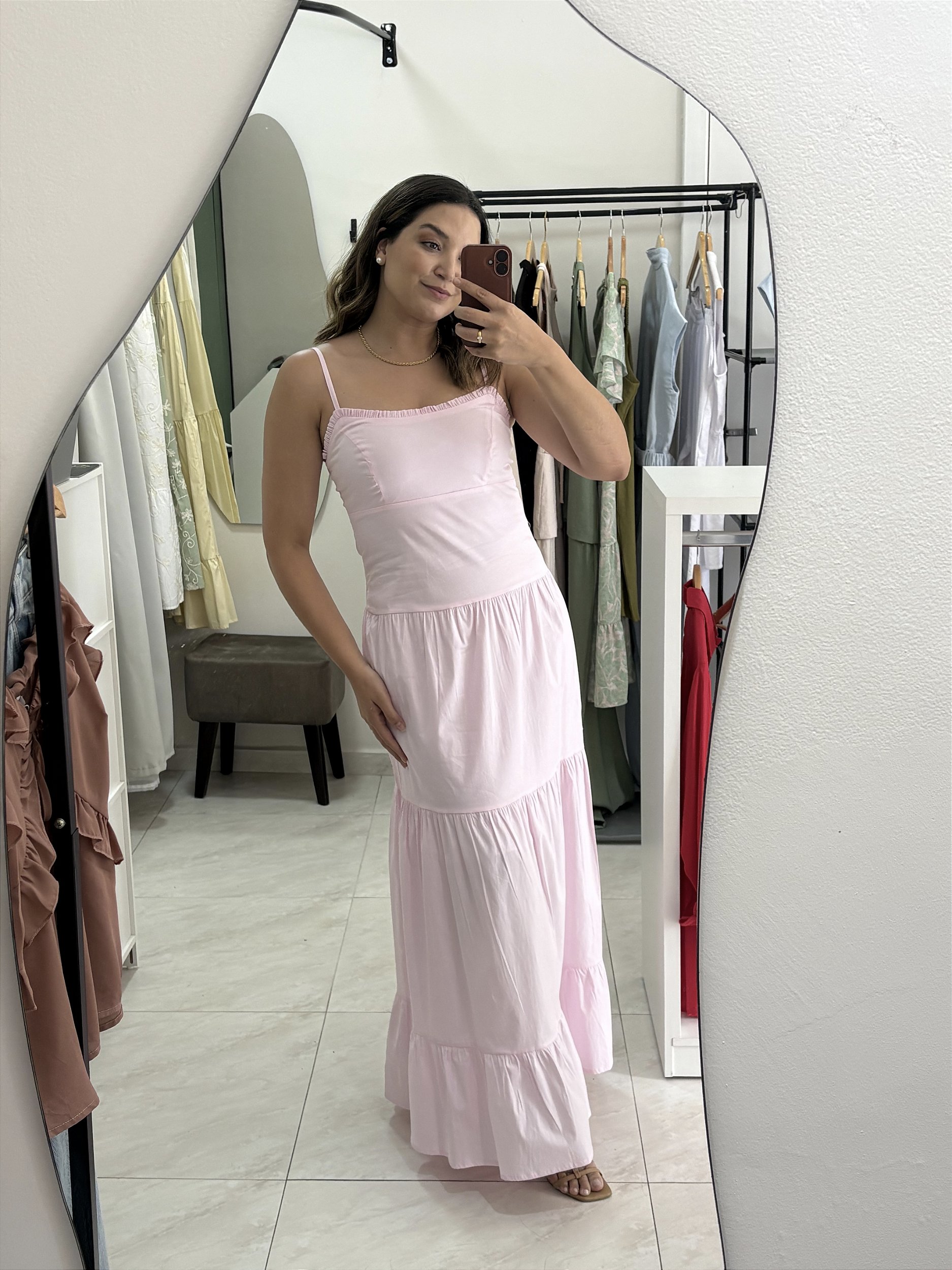 Vestido encantador... recorte de cós baixo, busto com babados, alça regulavel, saia estilo tres marias, decote nas costas com amarração e elastico, deixando a vestimenta facil e confortavel.